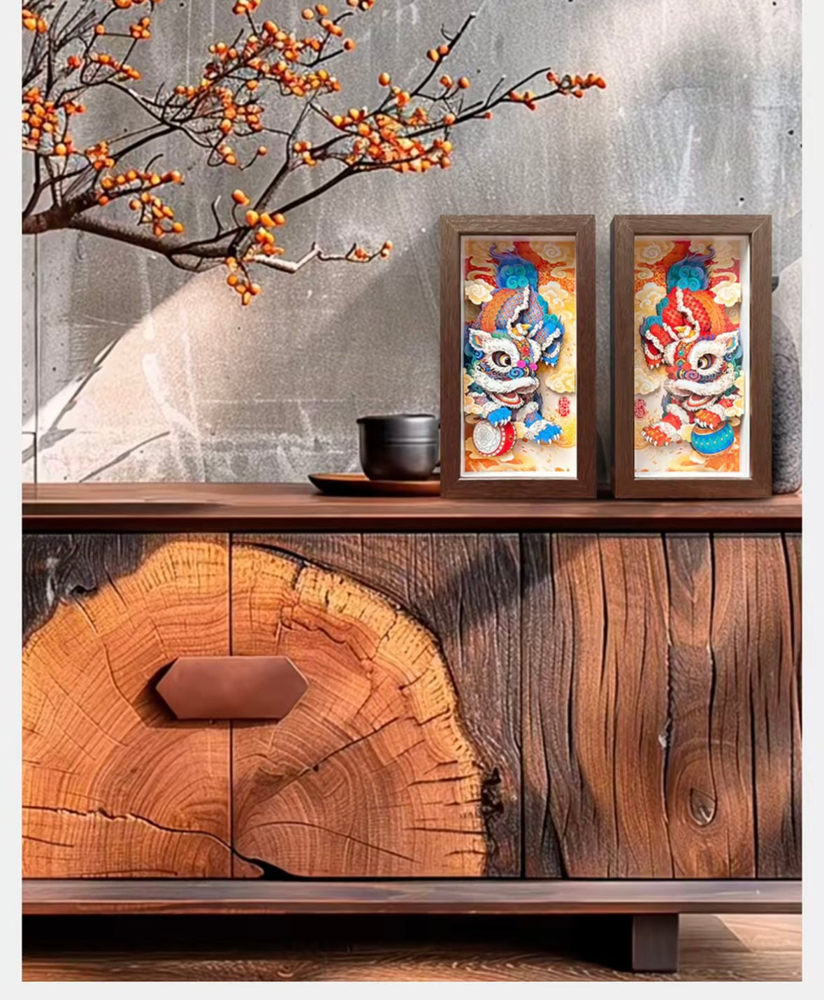 A pair of beautifully crafted paper-cut featuring the traditional Chinese lion dance, perfect for home decoration.